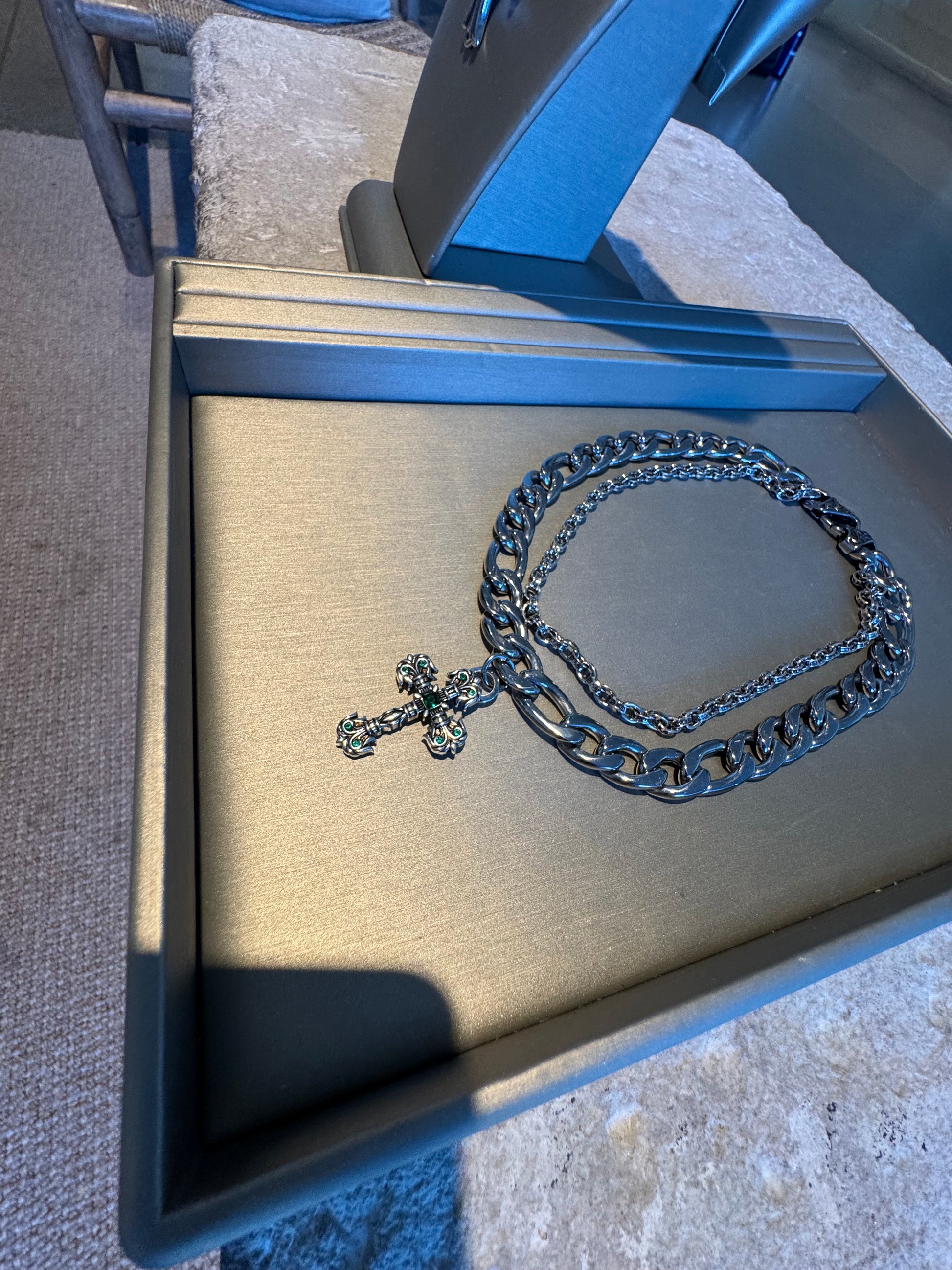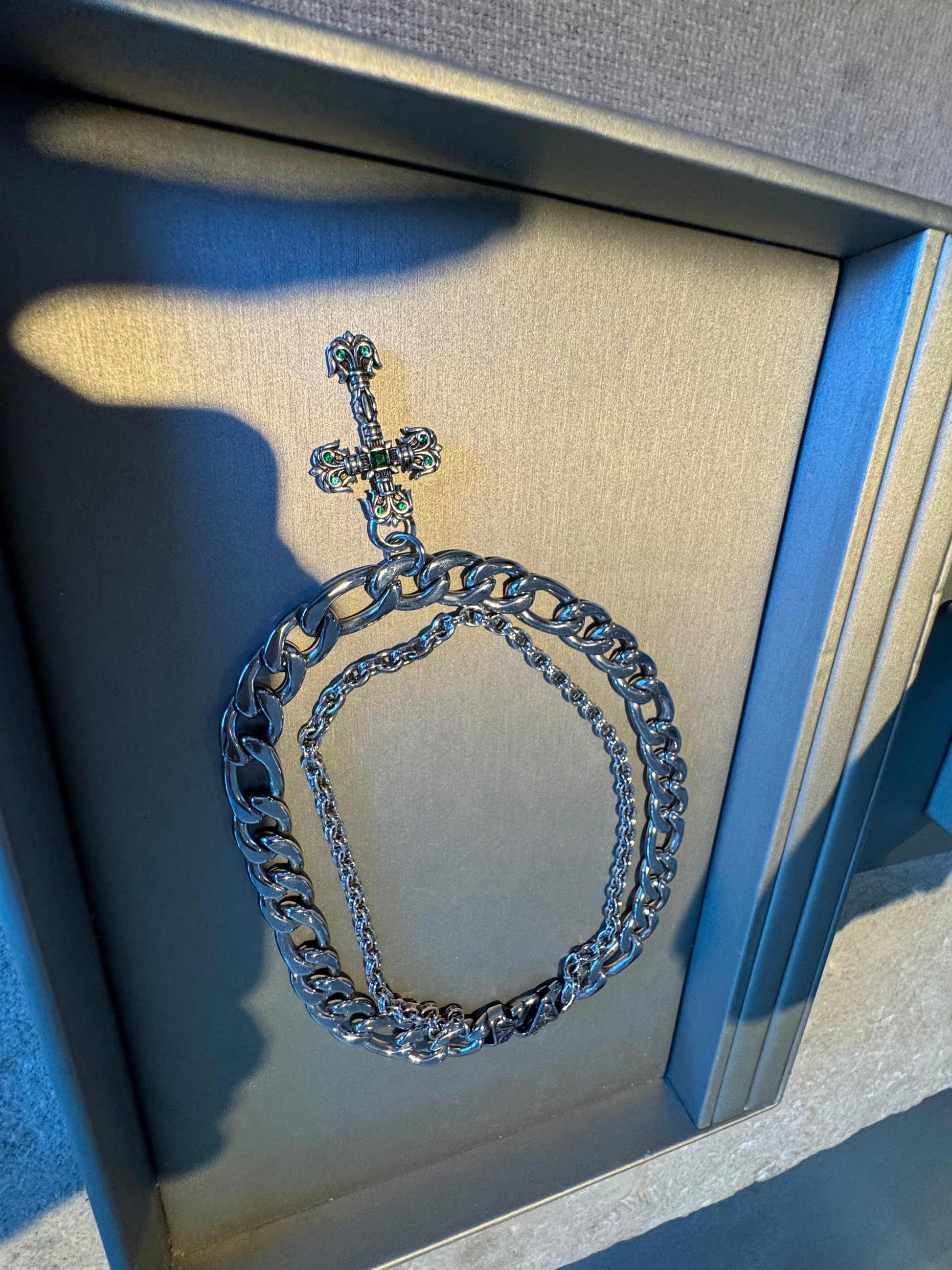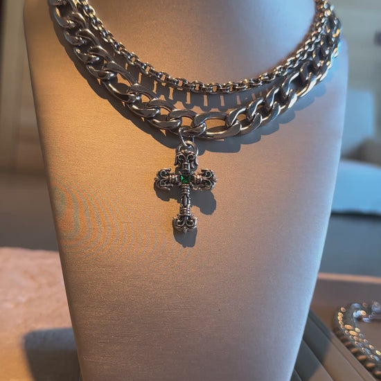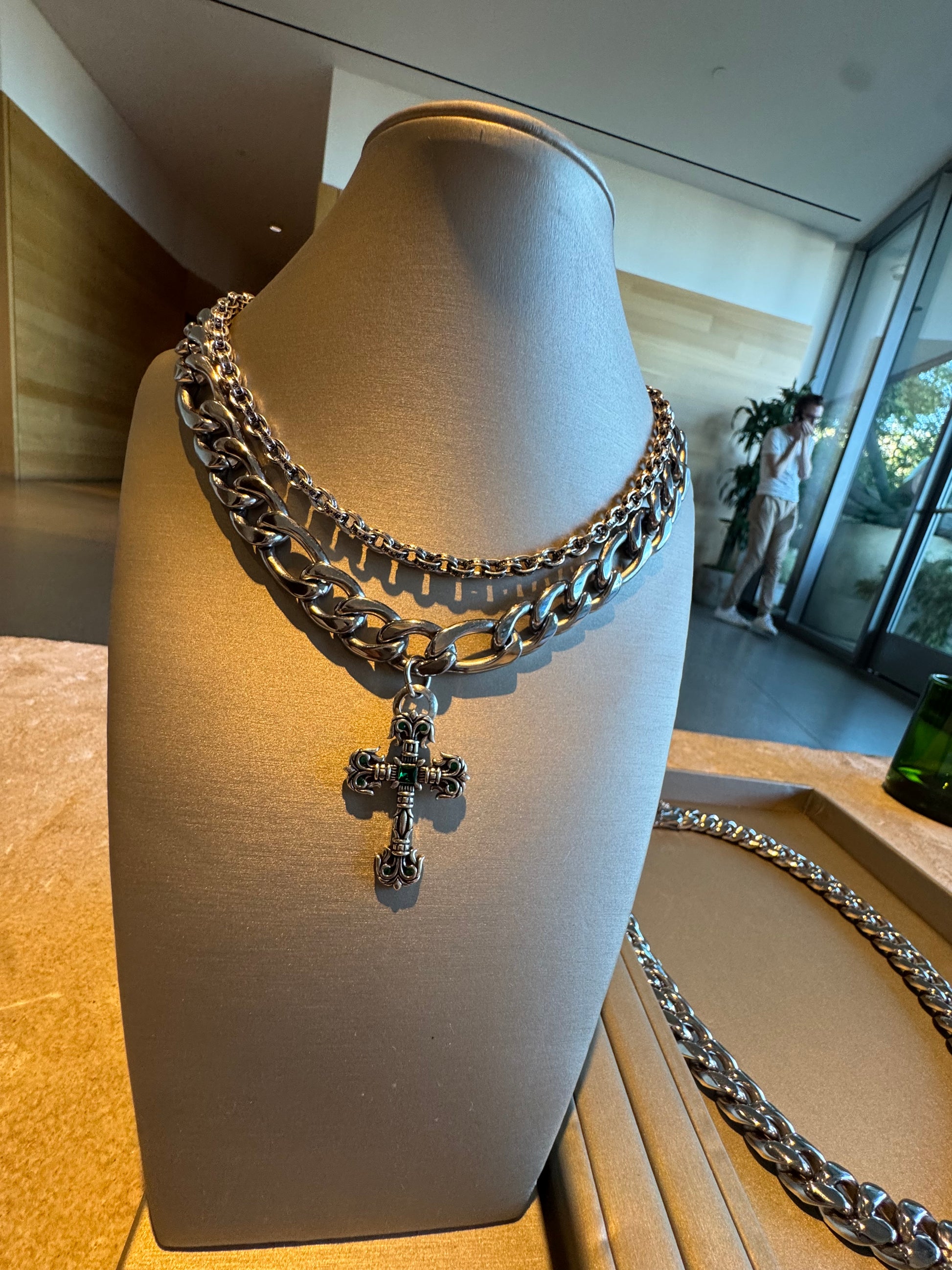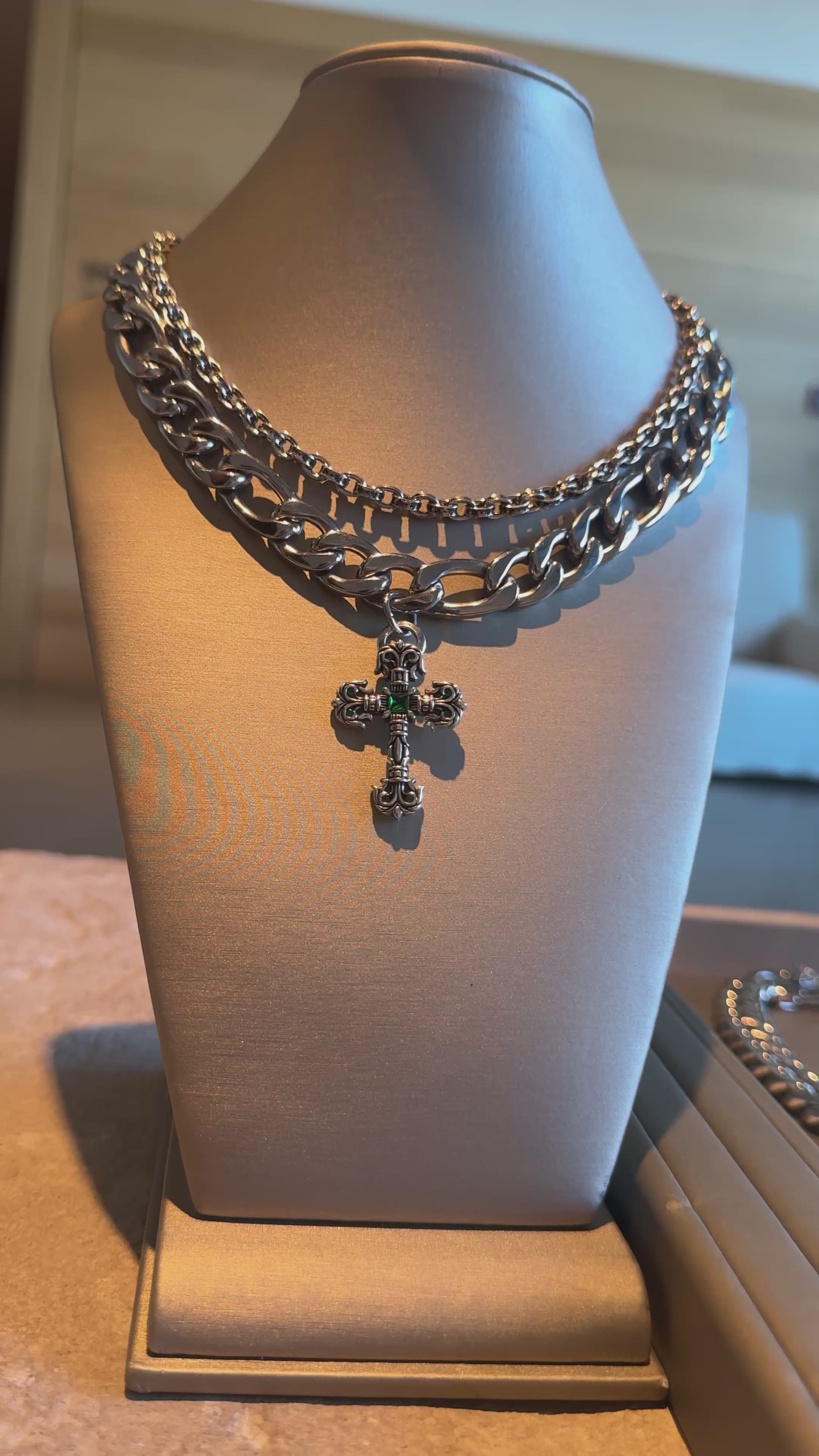 The Cuban link necklace features a rounded neckline measuring 17 inches and an attached ram-headed clasp connector. An engraved cross adorns the center, adorned with an emerald stone. This exquisite necklace is meticulously crafted to perfection.